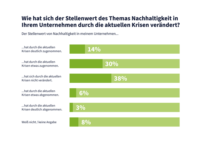 Wie bereits in den Vorjahren hat der Betreiber der europaweit führenden Online-B2B-Plattformen wlw (früher „Wer liefert was") und europages über das Marktforschungsinstitut YouGov Entscheider aus kleinen und mittelständischen deutschen Unternehmen angesprochen und nach ihrer wirtschaftlichen Lage und Einschätzung befragt. Dabei zeigte sich: Die Auswirkungen der aktuellen Krisen haben den Stellenwert des Themas Nachhaltigkeit in KMU nicht geschmälert – im Gegenteil. So sank der Anteil der Befragten, die angaben, der Stellenwert hätte sich nicht verändert, von 44 auf 38 Prozent. „Deutlich" oder „etwas" zugenommen hat der Stellenwert von Nachhaltigkeit laut Umfrage bei 45 Prozent der Unternehmen (2022: 41 Prozent). Von einer Abnahme der Bedeutung des Themas Nachhaltigkeit berichten nur 9 Prozent der Befragten.