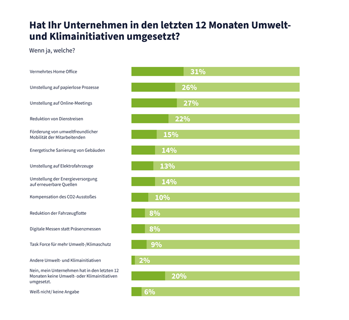 Während sich pandemiebedingte Maßnahmen rund um Remote Work – wie Home-Office und Online-Meetings – fest im Arbeitsalltag etabliert haben, setzen Unternehmen zudem verstärkt auf Initiativen mit primär klima- und umweltfreundlichem Effekt. 14 Prozent stellten ihre Energieversorgung auf erneuerbare Quellen um (12 Prozent in 2022); ebenso viele investierten in die energetische Sanierung ihrer Gebäude – ein Plus von immerhin drei Prozent für diese meist sehr aufwändige und kostenintensive Maßnahme. Die Förderung umweltfreundlicher Mobilität der Mitarbeitenden rutscht hoch auf Platz fünf der häufigsten Maßnahmen mit einem Plus von vier Prozent.