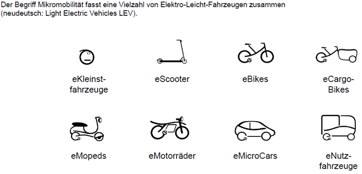 Elektrische Leichtfahrzeuge (LEV) gelten als die neue Fahrzeug-Alternative zum Auto und sind technische Vehikel der Antriebswende. Was der Normalverbraucher oftmals allein mit Angeboten wie eScootern und Pedelecs verbindet und der Regulierer in mehrere Untergruppen teilt, ist inzwischen ein gewachsenes Feld vielfältiger Fahrzeuginnovationen der Mikromobilität. Zu ihnen gehören neben den Fahrzeugen der Elektro-Kleinstfahrzeuge-Verordnung (eKFV) bis 20 km/h genauso zweirädrige, dreirädrige oder vierrädrige Kraftfahrzeuge ab 25 km/h, die zum Fahren auf öffentlichen Straßen bestimmt sind und die sowohl Personen- als auch Logistikfahrzeuge umfassen. Um das gesamte Spektrum abzudecken, wurden in der Studie zusätzlich die in Deutschland nicht zugelassenen Elektro-Kleinstfahrzeuge ohne Lenkstange aufgenommen.
