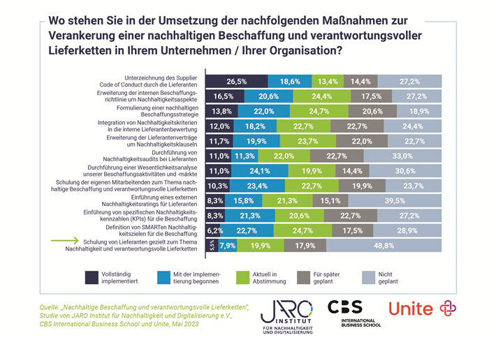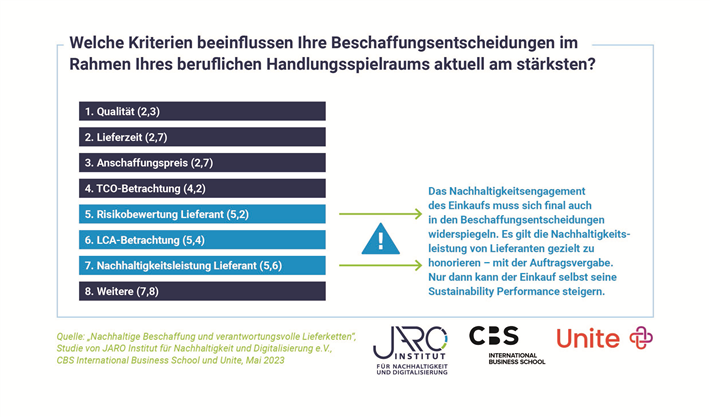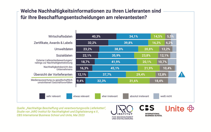 Das Thema Nachhaltigkeit im Einkauf ist für Unternehmen wichtiger denn je. Das belegt die neue Studie „Nachhaltige Beschaffung und verantwortungsvolle Lieferketten 2023" des JARO Instituts für Nachhaltigkeit und Digitalisierung e. V. in Zusammenarbeit mit der CBS International Business School und der B2BBeschaffungsplattform Unite. 65 Prozent der Befragten halten das Thema für sehr relevant; bei der Referenzstudie im Jahre 2020 waren es nur rund 54 Prozent.