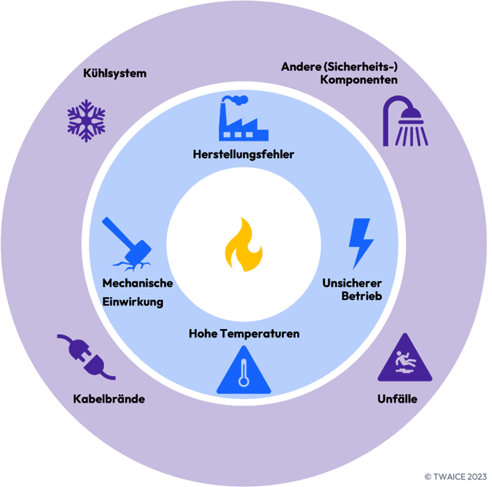 Spricht man über Batteriebrände, kann man hauptsächlich zwei Bereiche orten: Die Batterie selbst und äußere Umstände. Ein Mangel an der Batterie, der zu einem unsicheren Betrieb führen könnte, wäre beispielsweise eine Fehlfunktion des Batterie-Management-Systems, die zu einem Überladen der Batterie führen könnte. Dies verursacht übermäßige Hitze im Inneren der Batterie. Die Wärmeentwicklung kann weitere Reaktionen auslösen, die letztlich einen internen Kurzschluss verursachen können. Generell kann eine Nutzung im Grenzbereich den Gesundheitszustand der Batterie im Laufe der Zeit verschlechtern und zu einer Schwellung der Batterie führen, wodurch sie anfälliger für Brände würde. Auch Herstellungsfehler oder mangelhafte Qualitätskontrolle ebenso wie physische Schäden an der Batterie wie z. B. Einstiche, Quetschungen oder ständiger Druck auf das Batteriegehäuse könnten zu internen Kurzschlüssen und Batteriebränden führen - die Wahrscheinlichkeit solcher Risiken ist jedoch extrem gering. Die wenigsten Sicherheitsvorfälle sind auf die Batterie selbst zurückzuführen. Es gibt viele Faktoren rund um eine Batterie, die versagen können. Hier handelt es sich um den "äußeren Risikobereich”. Um hier nur ein Beispiel zu nennen ist das Kühlsystem eines Elektrofahrzeugs oder eines Energiespeichersystems darauf ausgelegt, den optimalen Temperaturbereich der Batterie - in der Regel zwischen 20 und 40 °C - aufrechtzuerhalten. Ein Überschreiten der sicheren Betriebstemperatur (über einen längeren Zeitraum) aufgrund eines Ausfalls des Kühlsystems kann zu beschleunigter Alterung, könnte aber auch zu einem Brand führen. Auch Kabelbrände können eine Ursache sein, denn wenn Kabel innerhalb einer Batterie beschädigt werden, zum Beispiel durch mechanische Beanspruchung, durch extremen Fahrzeugbetrieb oder unsachgemäße Wartung, führt dies zur Überhitzung der Kabel, die schließlich einen Brand auslösen können.