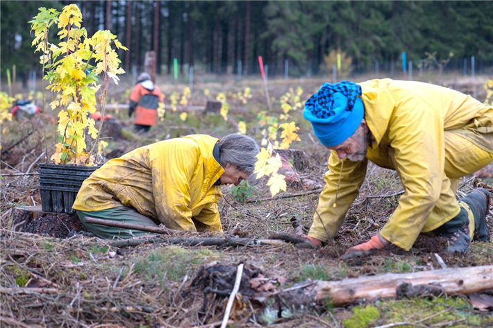 Freiwillige pflanzen Bergahorn auf Freifläche in Braunlage (Harz), ehemalige Fichtenmonokultur, die als Folge der menschengemachten Klimakrise abgestorben ist. © Bergwaldprojekt e.V.