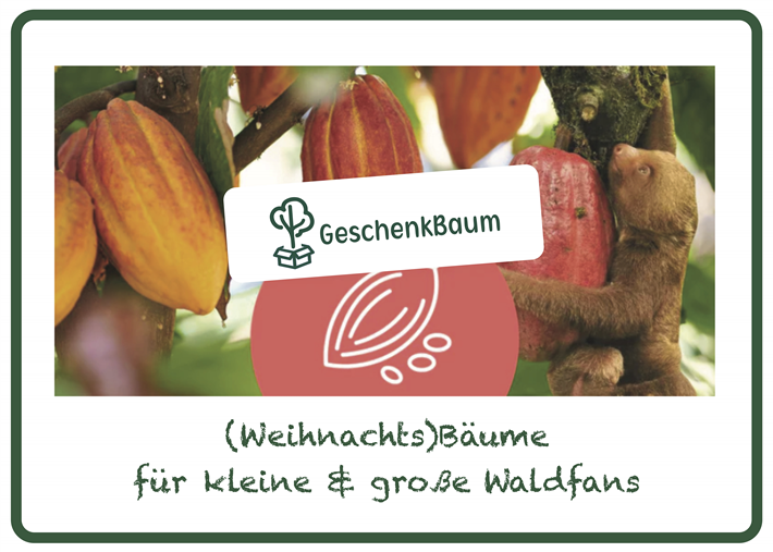 Weihnachtsbäume mal anders: in tropisch, edel und süß. Sie passen sogar in Briefkasten! Wie das geht? Mit Baumpatenschaften für Regenwald- oder Kakaobäume. Alle Paten bekommen eine Urkunde mit den Geo-Daten des Baumes und unser Versprechen, Baum für Baum Wälder zu pflanzen und zu schützen.