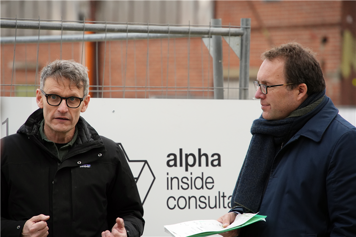 In seiner Ansprache hob Sebastian Hölzlein das Besondere an der Gewerbeimmobilie, die ab sofort RESI, heißen wird, hervor. Er sei froh, nach 15 Jahren des Suchens in der Stadt Bamberg an so einem historischen Ort und gleichzeitig zukunftsweisenden neuen Stadtteil, eine neue Heimat für die Alpha IC und das Schwesterunternehmen Serthoro GmbH gefunden zu haben. „Wir sind Nachhaltigkeitsberaterinnen und -berater und wollten ein nachhaltiges Lowtech Gebäude bauen. Deshalb steckt viel Bauphysik, Simulations- und Entwicklungsarbeit unserer eigenen Mannschaft und aller Beteiligten darin. Es wird ein Haus ohne Heizen und Kühlen sein, das mit seiner Photovoltaik-Anlage auf dem Dach eine ausgeglichene CO2-Bilanz aufweist."