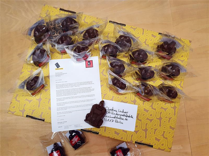 „Mit Ihrer Blockade verhindern Sie die Einführung von effektiven Maßnahmen gegen die Verletzung von Menschenrechten und Schäden an der Umwelt durch Konzerne", schreibt gebana, Pionierunternehmen für fairen Handel, an Finanzminister Christian Lindner und fordert ihn auf: „Lösen Sie die Blockade der FDP gegen ein effektives EU-Lieferkettengesetz!" Zusammen mit diesen Worten erhält Christian Lindner ein Paket gefüllt mit Angry Gorillas aus Schokolade.