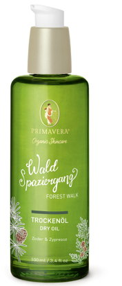 Das schnell einziehende Trockenöl Waldspaziergang aus der PRIMAVERA Organic Skincare Körperpflegelinie (19,00 € 100 ml) ist eine duftende Komposition naturreiner Pflanzenkraft: Bio Wildrosenöl, schwarzes Bio Johannisbeersamenöl, Bio Kameliensamenöl und Bio Traubenkernöl, welches reich an ungesättigten Fettsäuren ist, versorgen die Haut mit intensiver Pflege, beruhigen sie und fördern ihre Regeneration.