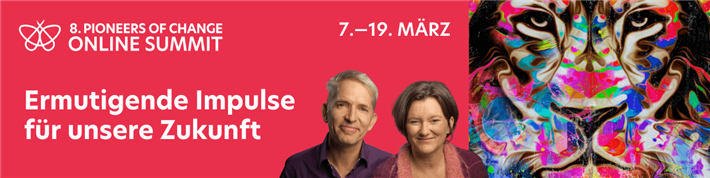Beim kostenfreien 8. Pioneers of Change Online Summit unter dem Motto „Mut zu Mut" inspirieren über 30 internationale Vorbilder, wie eine sozial-ökologische Transformation gelingen kann. Mit ihrem Beispiel ermutigen sie dazu, selbst aktiv zu werden und die Gesellschaft von morgen mitzugestalten. Erwartet werden wieder rund 60.000 Teilnehmende aus dem ganzen deutschsprachigen Raum.