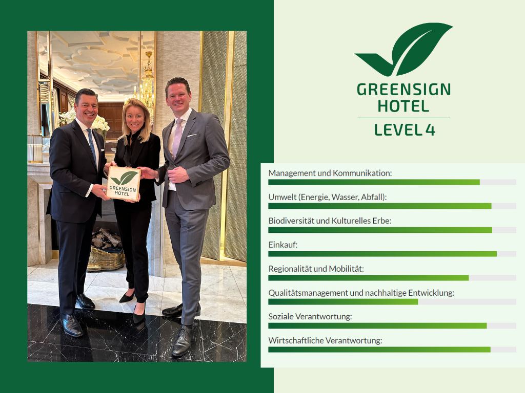 Das Hotel Vier Jahreszeiten Hamburg hebt sich in der Luxushotellerie durch sein Engagement für Nachhaltigkeit hervor und hat dafür die Auszeichnung GreenSign Hotel Level 4 erhalten. Das GreenSign Institut würdigt das Hotel als Musterbeispiel für Ressourcenschonung und Fairness.