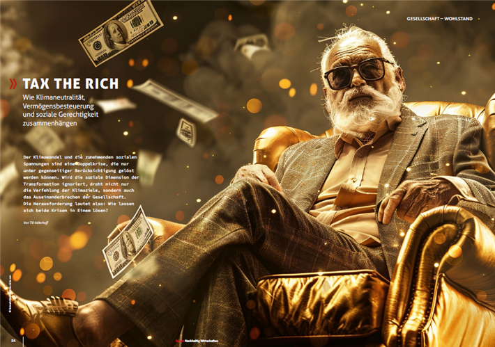"Tax the Rich". Wie Klimaneutralität, Vermögens-besteuerung und soziale Gerechtigkeit zusammenhängen" von Till Kellerhoff. |
