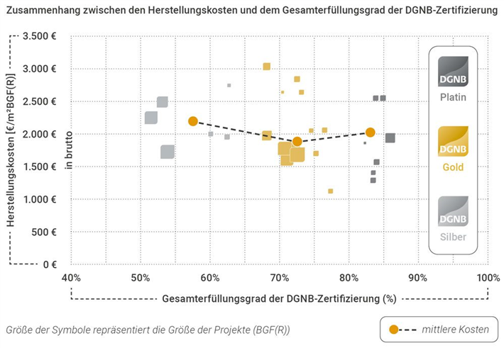 Zu den zentralen Erkenntnissen der Kurzstudie zählt, dass eine lebenszyklusoptimierte Bauweise nicht notwendigerweise teurer sein muss. Im Vergleich aller ausgewerteten Projekte zeigt sich, dass eine besonders klimaschonende Art des Bauens auch mit deutlich günstigeren Erstellungskosten möglich ist. Die Vermutung, dass ein grundsätzlicher Zusammenhang besteht zwischen niedrigen CO2-Emissionen im Betrieb und höheren Baukosten, bestätigte sich ebenfalls nicht. Im Gegenteil: Es ließ sich sogar eine leichte Tendenz erkennen, dass Gebäude mit geringer Klimawirkung im Betrieb niedrigere Baukosten aufweisen.Auch eine Korrelation zwischen dem erzielten Zertifizierungsergebnis und den Baukosten ließ sich nicht erkennen. Es gibt sogar einige Projekte, die mit Platin die höchste Auszeichnungsstufe bei der DGNB Zertifizierung erreicht haben und deutlich geringere Kosten verzeichnen als Wohnbauten, die lediglich ein DGNB Zertifikat in Silber erhalten haben.