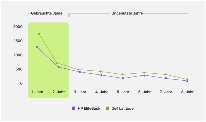 Die nächste Grafik zeigt aber auch, dass nach starkem anfänglichen Wertverlust, die Kurve abflacht und der Wertverlust nach den ersten 3 Jahren abnimmt über die Zeit. Dies bedeutet, dass gebrauchte IT-Assets nach der initialen Phase einen relativ stabilen Marktwert haben (Man sagt, dass ab dem dritten Jahr jeder Monat noch einen Wertverlust von 1,5-2 % aufweist).