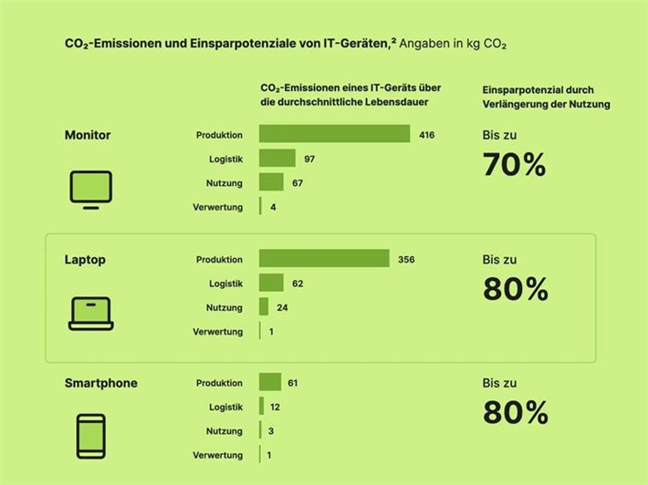 [2] circulee-Kalkulation, basierend auf unabhängiger Marktforschung im Auftrag von CHG-MERIDIAN AG, 2021. Maximales Einsparpotenzial wird erreicht, wenn die Verlängerung der Nutzung der angenommenen Gesamtnutzungsdauer entspricht (Monitor 51 Monate, Laptop 51 Monate, Smartphone 36 Monate).