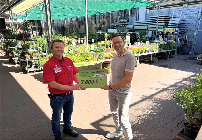 Mit einer erfolgreichen Aktionswoche rund um den Internationalen Tag der Bienen hat toom 7.600 Euro für den Wildbienenschutz gesammelt. Für jede verkaufte Pflanze aus dem „Nützlingsfreundlich"-Sortiment spendete die Baumarktkette 10 Cent an die Heinz Sielmann Stiftung. Die Spende fließt in die Gestaltung eines Wildbienengartens am neuen Natur-Erlebniszentrum Döberitzer Heide bei Berlin. Die symbolische Scheckübergabe fand gestern in der toom Filiale in Berlin-Friedrichshain statt.