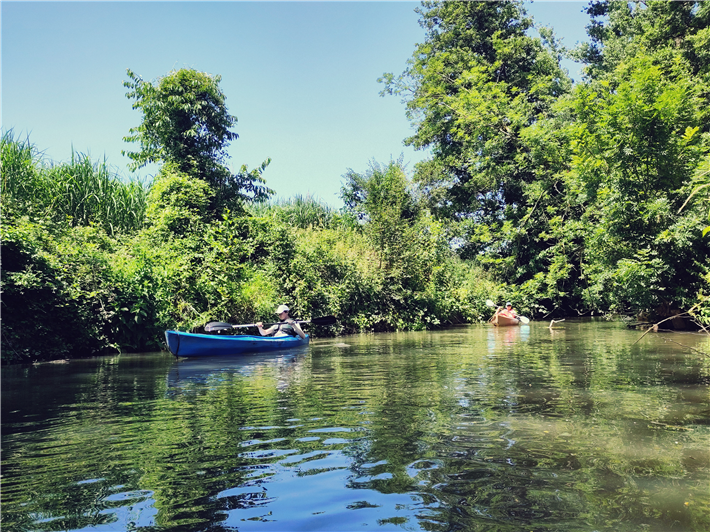 Von der kleinen Elsenz ins große Meer: Bei der Erlebnistour von Engagement Global entdecken Teilnehmende die Zusammenhänge zwischen lokalem Naturschutz und den globalen Nachhaltigkeitszielen. Im Kajak erkundet die Gruppe die Natur vor der Haustür und erfährt dabei Wissenswertes über die Herausforderungen des Gewässerschutzes weltweit.