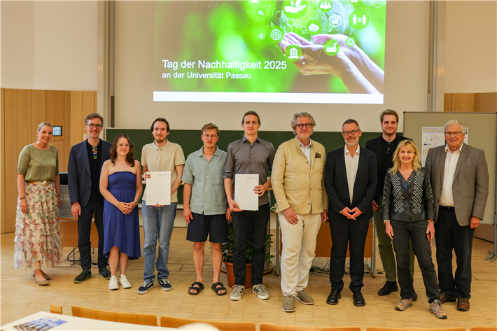Eingebettet in die Nachhaltigen Wochen vom 23. Juni bis 5. Juli mit Vorträgen, Workshops und vielen weiteren Aktionen fand am Donnerstag, 3. Juli, wieder der „Tag der Nachhaltigkeit" statt. In diesem Jahr mit einem Programm in zwei Teilen: Ab 13 Uhr luden die Universität Passau und die Vereinigung Deutscher Wissenschaftler (VDW) zum Aktionstag „Grenzen überwinden" ein. Dieser begann mit einem Impulsvortrag des Ehrenpräsidenten des BUND Naturschutz und Vorstands der VDW Prof. Dr. Hubert Weiger zum Thema nachhaltige Grenzüberwindung. Die Studierenden aus insgesamt sechs interdisziplinären Lehrveranstaltungen hatten ihre Studienprojekte bereits über das ganze Sommersemester 2025 vorbereitet und die erworbenen Kenntnisse in einer von Prof. Weiger geleiteten zweitägigen Exkursion zum „Grünen Band", dem ehemaligen „Eisernen Vorhangs" zwischen West- und Osteuropa, einem Praxistest im Gelände unterzogen. Ihre Ergebnisse konnten nun im Rahmen des Tages der Nachhaltigkeit in einer vielseitigen Poster-Ausstellung präsentiert werden. Diesem Auftakt folgte der offizielle Festakt im Audimax der Universität. Vizepräsidentin Prof. Dr. Bettina Noltenius begrüßte in ihrem Willkommenswort die rege Beteiligung aus allen Bereichen der Universität und der Stadt: „Ihre Anwesenheit bestätigt uns auf unserem Weg, das Thema Nachhaltigkeit auf allen Ebenen mitzudenken." Der Bayerische Staatsminister für Umwelt und Verbraucherschutz, Thorsten Glauber, unterstrich in seinem Grußwort unter anderem die Bedeutung der Hochschulen: Hier leiste die Universität Passau einen einmaligen Beitrag, nicht nur mit wegweisenden Bau- und Forschungsprojekten, sondern auch beispielsweise dadurch, dass sie inzwischen eine Stelle für ein Freiwilliges Ökologisches Jahr anbiete – an Hochschulen immer noch eine Seltenheit. Es sei wichtig, dass Universitäten in Richtung Nachhaltigkeit vorangehen, dass sie erklären, die Ideen hinaustragen und die Menschen vor Ort miteinbeziehen. Eine Universität sei besonders gut geeignet als Nährboden für Nachhaltigkeit: „Wer heute hier studiert und forscht, entscheidet morgen die wichtigen und extrem nachhaltigen Zukunftsthemen."