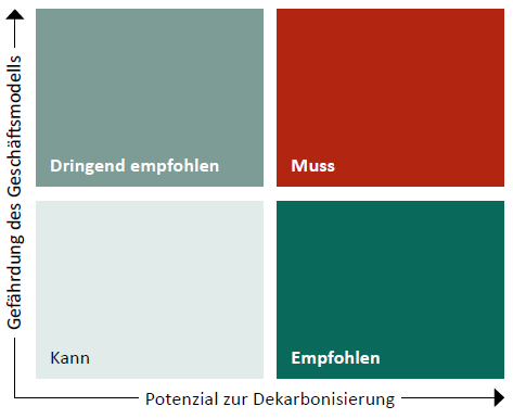 Beispiele für „Muss"-Unternehmen sind Unternehmen der Automobilindustrie und der Energiewirtschaft. Die zum Teil komplexen und ressourcenintensiven Lieferketten der Automobilindustrie sind anfällig für physische und transitorische Klimarisiken, die die Liefersicherheit einschränken. Gleichzeitig hat ein Automobilhersteller entlang der gesamten Wertschöpfungskette ein hohes Potenzial zur Dekarbonisierung. Dieses geht in der Regel mit Kostensenkungen durch effizientere und ressourcenärmere Wertschöpfungsschritte einher. Die Produktebene selbst hat durch die E-Mobilität und weitere Innovationen das größte Potenzial für die Dekarbonisierung – dieses ist 1:1 mit dem Geschäft und der Zukunftsfähigkeit des Unternehmens verbunden.