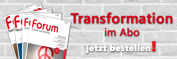 | Das aktuelle forum-Heft mit dem Titel "Zukunft braucht Frieden" können Sie zum Preis von 10,00 EUR zzgl. 3,- EUR Porto & Versand (innerhalb von Deutschland) oder versandkostenfrei als PDF-Magazin direkt beim Verlag bestellen. Oder fordern Sie gleich Ihr persönliches forum-Abo an. |