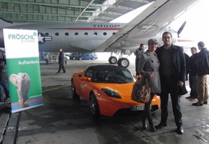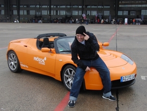 Mein heutiges Ziel ist Berlin. Da auf der Fahrt dorthin keine Zeit bleibt, um zwischendurch zu laden, bedeutet das für den Tesla Roadster, er muss ausnahmsweise mit dem Anhänger Vorlieb nehmen. Auf dem Gelände des stillgelegten Flughafens Tempelhof haben die Veranstalter des Clean Tech Media Awards einen neuen Event ins Leben gerufen: den eDay - einen Tag rund um das Thema Elektromobilität. Rund 600 geladene Gäste aus Politik, Wirtschaft, Wissenschaft und Medien haben hier die Möglichkeit, über 50 verschiedene Elektrofahrzeuge zu testen. Als zukünftiger Lieferant von intelligenten Stromladesystemen stellt Fröschl Systems bei dieser Veranstaltung den Tesla als Testfahrzeug zur Verfügung - und ich mich selbst als Testfahrer. Egal ob Redakteure oder Prominente - jeder ist begeistert, dass sportliches Fahren tatsächlich gleichzeitig umweltfreundlich sein und so großen Spaß machen kann. Hat sich die Reise doch schon gelohnt.