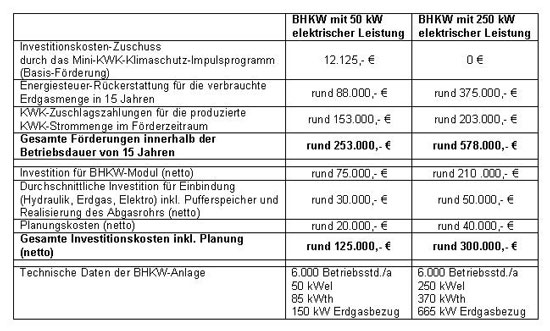 Die wirtschaftlichen Voraussetzungen für einen BHKW-Einsatz waren noch nie so gut wie heute. Anlagen, die mit Erdgas, Flüssiggas oder Heizöl betrieben werden, erhalten auf Antrag die Energiesteuer für den im BHKW eingesetzten Brennstoff zurück erstattet. Außerdem erhalten BHKW-Anlagen bis 50 kW gemäß dem KWK-Gesetz zeitlich befristet für jede produzierte Kilowattstunde Strom einen KWK-Zuschlag von 5,11 Cent. Größere Anlagen erhalten eine Vergütung von 2,1 Cent/kWh. Mini-BHKW-Anlagen bis 50 KW elektrischer Leistung erhalten außerdem in Abhängigkeit von der Leistungsgröße einen Zuschuss für die Investition (www.kwkg-novelle.de). Tabelle 1 erläutert eindrucksvoll, dass die über 15 Jahre erhaltenen Zuschüsse die jeweiligen Investitionskosten deutlich übersteigen.
