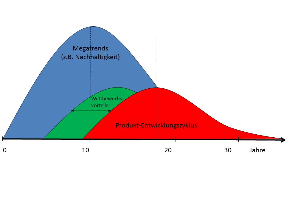 Zurzeit gibt es einige Megatrends. Das sind Demographie, die Rolle der Frauen in der Wirtschaft, Bildung, Mobilität, Urbanisierung, Ökonomie-Konvergenz und Klimaschutz. Sie sind heute in unterschiedlichem Maße wahrnehmbar und beeinflussen z.B. das Konsumverhalten. Unternehmen, die Megatrend-Signale wahrnehmen, können rechtzeitig und adäquat Maßnahmen für den Erhalt der Wettbewerbsfähigkeit oder gar ihr Überleben ergreifen. Verpasst das Unternehmen dagegen die Chance, droht das Verschwinden vom Markt. Ein Beispiel hierfür ist die Entwicklung der Digitalkamera. Große bekannte Weltunternehmen haben den Trend "verschlafen" und existieren deshalb nicht mehr. Es versteht sich von selbst, dass, je früher auf die Marktsignale der Megatrends reagiert wird, der Wettbewerbs-Vorsprung umso größer ist. In den meisten Fällen aber stellen sich die Unternehmen sehr spät auf Marktveränderungen ein und adaptieren entsprechend ihre Produkte und Dienstleistungen praktisch in letzter Sekunde, aufgrund des Marktdrucks (wenn der Megatrend im Zenit steht), um ihre Markposition zu retten. Da aber die Umstellung der Produkte und Dienstleistungen meistens längere Zeit in Anspruch nimmt, können sie in der Regel erst dann zur Verfügung stehen, wenn der Markt von den Wettbewerbern besetzt und möglicherweise die Trendwende in Sicht ist. Die Entwicklung der Mobilfunk-Endgeräte in Deutschland ist ein Beispiel solcher verpassten Chancen.