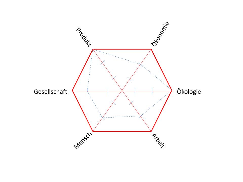 Die Nachhaltigkeitsreports geben die Resultate der aggregierten Leistungsbilanz des Unternehmens wieder. Liegt z.B. GRI zugrunde, werden sechs Segmente (siehe Bild-3), die das Unternehmen in seinem Nachhaltigkeitsprofil beeinflussen (Ökonomie, Ökologie, Arbeit, Mensch, Gesellschaft, Produkt) untersucht. Um das erarbeitete Profil auch als Grundlage der Gestaltung der Zukunft und damit des Veränderungsprozesses zu nutzen, ist ein nächster Schritt, die Analyse der KPI´s der einzelnen Instanzen der gesamten Wertschöpfungskette erforderlich.