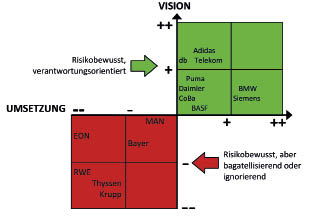 Die Ergebnisse könnten, wenn man sie bildhaft darstellen wollte, wie in der Grafik 1 sichtbar gemacht werden. Auf der vertikalen Achse ist die Qualität der Nachhaltigkeitsvision eines Konzerns abgebildet; klare Vorstellungen für den Übergang zu einer nachhaltigen Wirtschaftsweise sind die Voraussetzungen für Veränderung. Die horizontale Achse gibt wieder, wie glaubwürdig die praktischen Umsetzungsschritte sind und welcher Ressourceneinsatz dahinter steht.