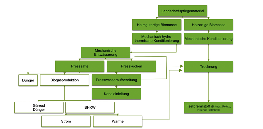 Die Pilotanlage des Forschungsprojekts verarbeitet halmgutartige feuchte Biomasse, wie z.B. Gras, Laub, Feuchtwiesenschnitt oder Straßenbegleitgrün zu Brennstoff. Dabei macht sie sich das zum Patent angemeldete florafuel-Verfahren "Waschen, Zerkleinern, mechanisch Trocknen, thermisch Trocknen und Verdichten (Pelletieren/ Brikettieren)" zunutze. Fermentierungsabfälle, wie Pferdemist oder Schilf, werden mit einem reduzierten Anlagenaufwand aufbereitet.
