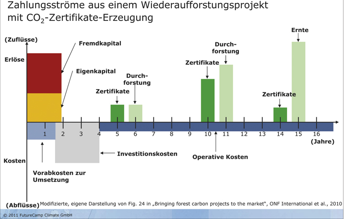 Schematisch dargestelltes Beispiel für Zahlungsströme aus einem Wiederaufforstungsprojekt unter Berücksichtigung der Erzeugung von CO2-Gutschriften. |