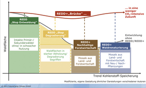 Je nach Ausgangslage in den einzelnen Ländern kommen bestimmte "REDD"- bzw. "REDD+"-Maßnahmen zum Tragen. Die globale CO2-Senke kann auf diese Weise zeitnah optimiert werden und das Klima entsprechend entlasten, bis die Welt insgesamt zu einer klimafreundlicheren Wirtschaftsweise gefunden hat. |