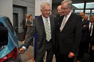 Baden-Württembergs Ministerpräsident Winfried Kretschmann und der Parlamentarische Staatssekretär im BMWi, Ernst Burgbacher testen den Ladevorgang beim Projekt MeregioMobil. |
