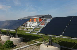 Photovoltaiktestfeld vor dem Laborgebäude im neuen Testzentrum Intelligente Netze und Elektromobilität SysTec des Fraunhofer IWES in Fuldatal-Rothwesten nahe Kassel. |