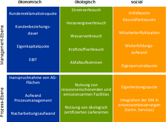 Auch die verschiedenen ökonomischen Kennzahlen werden für die beiden Ebenen ausgewiesen. Diese Trennung in zwei Ebenen ist für die Facility Management-Branche von einem besonderen Interesse, da sie zwei unterschiedliche Aspekte der Unternehmensperformance betonen: Während die Managementkennzahlen, wie andere Kennzahlensysteme auch, die Nachhaltigkeit eines Unternehmens messen, beantworten die Prozesskennzahlen darüber hinaus die Frage, wie nachhaltige FM-Services die Nachhaltigkeit der Kernprozesse des FM-Auftraggebers verbessern.