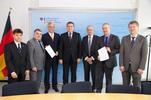 Vertragsunterzeichnung zwischen der PD und dem TÜV Hessen (v.l.n.r.): Jürgen Bruder (TÜV Hessen), Herbert Reul (MdEP), Reiner Block (TÜV Hessen), Parlamentarischer Staatssekretär Jan Mücke (BMVBS), Rolf-Dieter Schacht (TÜV Hessen), Dr. Johannes Schuy (Partnerschaften Deutschland), Karl-Heinz Heller (Partnerschaften Deutschland); |