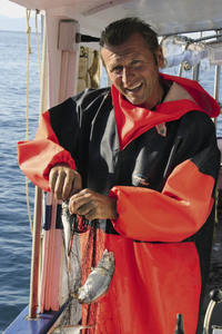 Meine Enttäuschung zeigt Wirkung, denn Lucio, der freundliche Mann, greift zum Handy. Kurz danach erklärt er mir, dass Paolo, il pescatore oder the fisherman, in einer Stunde kommen und mich und meine Söhne einfach mitnehmen wird. Zum Einholen der Netze, die er am Morgen gelegt hatte. Als wir später auslaufen erklärt Paolo, ein Naturbursche wie aus dem Bilderbuch, mit blitzenden Augen, wie er zum Pescaturismo gekommen ist. "Ich möchte den Leuten die Begeisterung für das Meer und seine Schätze nahebringen. Ich will ihnen zeigen, welche Fülle wir noch haben und wie bedroht sie auch ist. Ich breche eine Lanze für den verantwortungsbewussten Umgang mit dem Reichtum der Natur". Und dann verfinstert sich sein Blick. "Bei uns in Italien zerstört die Profitgier alles. Direkt vor der Küste hatten illegale Schleppnetzfischer in den letzten Jahren systematisch die Unterwasserfauna und -flora ruiniert. Da konnte ich doch nicht tatenlos zusehen!"