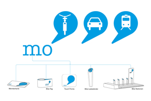 Das "mo"-System im Überblick - Oben: Fahrrad, Auto, ÖNV. Unten: Memberkarte, Bike-Tag, Touch Points, Bike Ladeständer, Bike Stationen. |