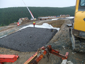 Ein weiterer Vorteil liegt in der Härte des Materials. Es ist hoch druckfest und damit sehr belastbar, gleichzeitig bestens zum Modellieren geeignet, um Unebenheiten des Untergrunds auszugleichen. Die hervorragenden bauphysikalischen Eigenschaften werden durch verarbeitungsfreundliche Vorteile ergänzt, wie z. B. die problemlose Umhüllung von Einbauteilen, wie Rohre etc.. Die lose Schüttung passt sich einfach und flexibel jeder Geländeform an. Auf der Landal Baustelle in Winterberg entstanden in kürzester Zeit 200 Ferienhäuser (130 im ersten Bauab-schnitt, weitere 70 im zweiten). Eine ausgeklügelte Logistik garantierte das reibungslose Nebeneinander der verschiedenen Gewerke. "Kontinuierlich wie eine La-Ola-Welle wuchsen die Ferienhäuser aus dem Hang. Während die eine Baugrube noch mit Geovlies ausgelegt wurde, konnte in der anderen schon der Dämmschotter eingebaut werden und in der benachbarten gingen zeitgleich die Betonarbeiten vonstatten", beschreibt Wolfram Müller, der die Baustelle für Glapor betreute, das perfekte Timing. Die fast 6.000 Kubikmeter Schaumglasschotter - von Glapor mit Lastzügen angeliefert - wurden zentral auf der Großbaustelle zwischengelagert und per Lader von den ortsansässigen ausführenden Baufirmen zu den einzelnen Baugruben gebracht. Insgesamt etwa 18.000 Quadratmeter Grundfläche konnten so in kürzester Zeit gedämmt werden. "Wartezeiten wurden damit vermieden und der extrem knappe Zeitrahmen eingehalten", freut sich Wolfram Müller über die gelungene Premiere, die bereits Folgeaufträge nach sich zieht.
