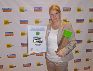 Dagmar Fritz-Kramer erhält Golden Cube in der Kategorie "Ökologie" für das Kundenhaus "Kieffer" vom Stuttgarter Fachschriftenverlag. |