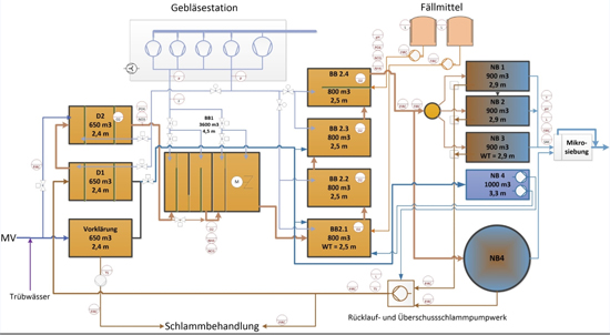 Belebungsbecken mit angestellten Rührwerken und Gebläsen. |