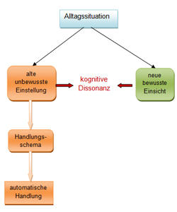 So kann auch Change Management in einem Unternehmen nicht gelingen, wenn es bei der Entwicklung bewusster Einsichten bleibt, denn damit hat weder eine Veränderung der unbewussten - und meist handlungsleitenden - Einstellungen stattgefunden, noch verfügen wir über neue Handlungsschemata. Was dann entsteht, nennen Psychologen "kognitive Dissonanz".
