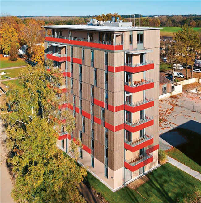 Noch viel mehr Holz durfte beim 8-Geschosser in Dornbirn – einem reinen Bürogebäude – sichtbar bleiben. Möglich war dies durch die Aufgeschlossenheit der Vorarlberger Behörden, aber auch durch neuartige Holz-Beton-Verbunddecken sowie Sprinkleranlagen. Holz-Beton-Verbunddecken wurden auch beim 2013 in Bad Aibling errichteten 5-Geschosser „H5" eingebaut. Er ist sozusagen eine Weiterentwicklung des 8-Geschossers „H8". Die beiden Gebäude sind Teil der dort entstehenden „City of Wood", einem Experimentierfeld des großen Wohnungswirtschaftsunternehmens B&O, das auf diese Weise wertvolle Erkenntnisse für die Nachverdichtung und Erneuerung bestehender Wohnanlagen sammelt. Während „Schankula Architekten" beim „H8" untersuchten, was mit Holz überhaupt realisierbar ist, stand beim „H5" die Kombination von Holz mit Stahlbeton im Fokus – vor allem in Hinblick auf eine mögliche Senkung der Baukosten. Die Ausgangsidee war, Betondecken auf Holzständerwände aufzulegen. Daraus entwickelte sich ein Bausystem, in dem sich exakt vorgefertigte Holz- und Betonelemente für Wände und Decken fast beliebig kombinieren lassen.