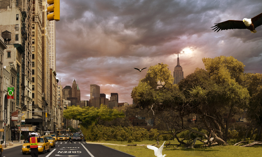 Es sind monumentale, detailverliebte, digitale Fotografien, die uns die Künstlerin Anke Schaffelhuber bietet, zum Teil bis zu 270cm breit, 200cm hoch und einem Datenvolumen von ca. 50 MB. Erst bei langer, intensiver Auseinandersetzung mit diesen aufrüttelnden und gleichzeitig unglaublich ästhetischen Visionen eröffnen sich einem alle Einzelheiten, alle Subtilitäten. Erst auf den zweiten Blick eröffnen sich alle Widersprüche, alle Absurditäten. Denn nichts anderes ist es, was diese Kunst kreiert durch die Vereinigung der Gegensätze von unberührter Natur und Industrialisierung/Urbanisierung, von Vergangenheit und Zukunft, von Ruhe und Hektik. Diese Kunst will provozieren, indem sie Unvereinbares zusammenführt, Unwahrheiten erzählt. Und doch ist ihre Provokation eher leise, eher still. Diese Kunst rüttelt auf durch Harmonie und Schönheit. Man sieht auf ihnen die in Wolken gehüllte Skyline von New York, die sich so prägnant schon vor langer Zeit in unser Gedächtnis gebrannt hat, im Sand einer Wüste von Botswana stehen. Man sieht den Fuß des wohlbekannten Pariser Wahrzeichens, den Eiffelturm, vor der Kulisse patagonischer Eisberge prangen. Oder man sieht Manhattan, im Hintergrund unverkennbar das Empire State Building, ein Weißkopfadler kreist am Himmel, das in die afrikanische Wildnis übergeht.