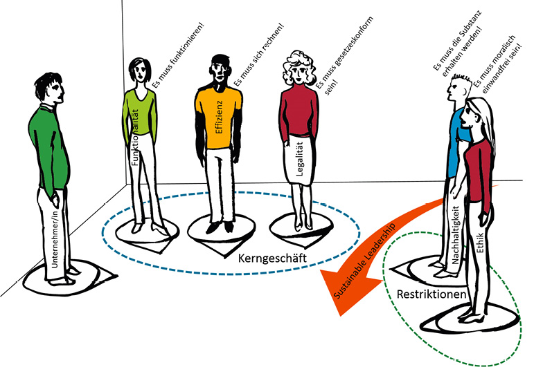 Die Unternehmer/in steht so, dass sie alles im Blick hat und seinen/ihren Fokus je nach Bedarf ausrichten kann. Als interessante Frage bleibt, wofür die Lücke steht, die sich zwischen den gegenüberstehenden Beteiligten gebildet hat. Sie steht für die Anforderungen an die Unternehmen: im Kerngeschäft zwar zu konkurrieren, aber beim Thema Nachhaltigkeit zu kooperieren. Sustainable Leadership könnte als neue Kompetenz diese Lücke schließen.