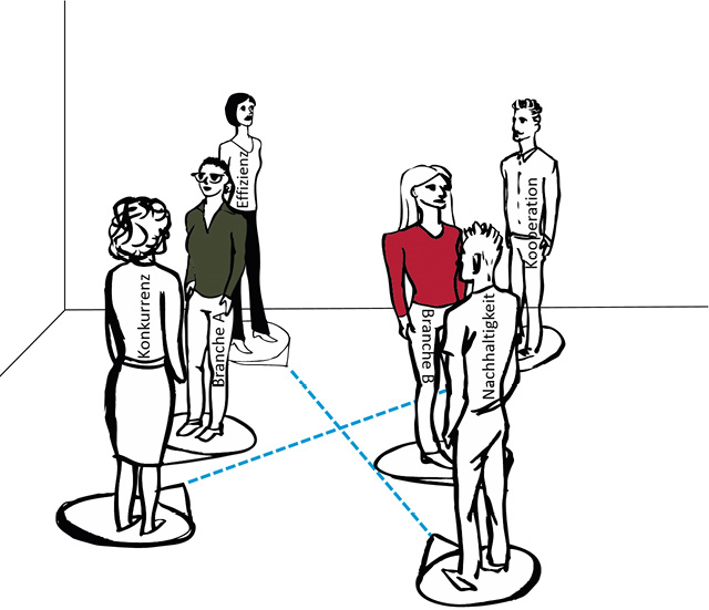 Raum für innovative Lösungen schaffenMenschen stehen im Raum für die Elemente eines Systems (z. B. Unternehmen, Effizienz, Nachhaltigkeit). Sie agieren miteinander oder gegeneinander nach ihren subjektiven Vorstellungen (Landkarten) zur Nachhaltigkeit. Ein intensiver Dialogprozess kommt in Gang. In den Köpfen der Beteiligten entsteht Raum für Assoziationen und Bilder, die neue Wege und Lösungen aufzeigen.