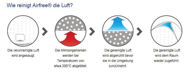 Die Airfree-Geräte saugen die Luft an und erhitzen sie im Inneren eines patentierten Keramikkerns auf 200 Grad Celcius. Dadurch werden alle organischen Luftschadstoffe wie Schimmelsporen, Bakterien, Viren und organische Allergene ganz natürlich durch Hitze zerstört. Die erhitzte, gereinigte Luft steigt auf. Sie wird noch im Gerät abgekühlt, sodass sich die Raumtemperatur nicht erhöht. Bei diesem Prozess entsteht eine Strömung im unteren Bereich des Geräts, die wiederum die verunreinigte Luft ansaugt – es ergibt sich eine kontinuierliche und wirksame Luftzirkulation. Pro Stunde lassen sich zwischen 14.000 und 20.000 Liter Luft sterilisieren. Das Verfahren ist völlig geräuschlos und erfordert weder Wartung noch Auswechseln von Zubehörteilen.