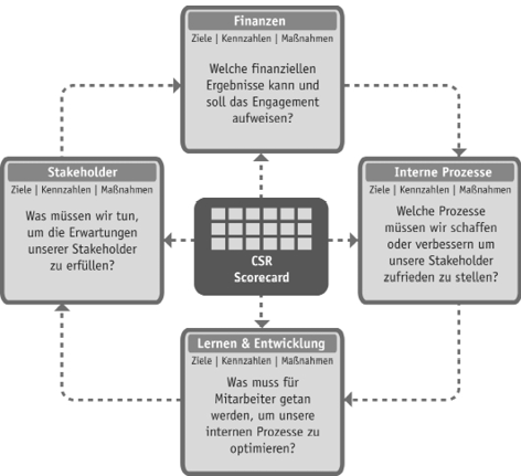 Mit Hilfe der CSR-Scorecard können Sie in Ihrem Unternehmen eine effektive Umsetzung und Steuerung der CSR-Strategie, sowie eine sinnvolle CSR-Erfolgskontrolle leisten. Die vier Perspektiven der BSC werden dabei auf die unternehmerische Verantwortung angewandt.