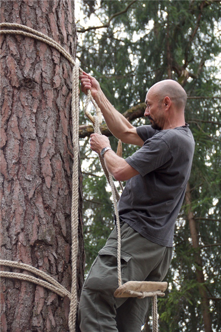 Andrzej Paszura zeigte, wie die Baschkiren die Bäume hinaufsteigen: Dazu werden rechts und links des eigenen Körpers Trittkerben in die Rinde geschlagen. Mit Hilfe eines geflochtenen Gurtes aus Rinderhaut hangelt sich der Zeidler dann Schritt für Schritt auf seine Arbeitshöhe und schlägt dann immer weitere Tritte mit der Axt. Seinen Standplatz baut er durch ein Trittbrett aus Holz, das um den Stamm gegurtet wird und worauf er sich dann wiederum mit einem speziellen Kraftakt hinaufstemmt.