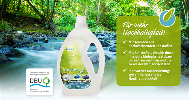 Gefördert durch die Deutsche Bundesstiftung Umwelt (DBU) hat die HAKA Kunz GmbH das flüssige HAKA Feinwaschmittel pur entwickelt, das in Sachen Nachhaltigkeit und Funktion Maßstäbe setzt. Das neue Waschmittel wird mit Tensiden aus nachhaltig produzierten, nachwachsenden Rohstoffen hergestellt. Gleichzeitig ist der Anteil dieser modernen und leistungsfähigen Tenside im Vergleich zu herkömmlichen Flüssigwaschmitteln am Markt deutlich reduziert, ohne dabei an Waschkraft zu verlieren. Die Rezeptur wurde nach den Kriterien des EU-Ecolabels und Öko-Test entwickelt. Die damit verbundene Unbedenklichkeit der Inhaltsstoffe für Mensch und Umwelt umfasst auch die Konservierungs- und Duftstoffe.