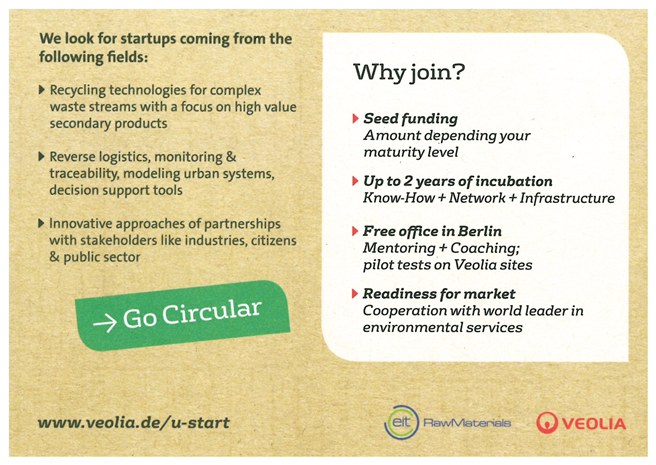 Ziel dieser Initiative ist die Aufnahme von bis zu fünf Startups in ein zweijähriges Inkubationsprogramm. Das Unterstützungspaket für die Kreislaufwirtschaft-Startups beinhaltet folgende Leistungen: Business-Coaching von EIT RawMaterials; industrielles Mentoring von Veolia; Seed Funding und Büros im EUREF-Campus in Berlin.