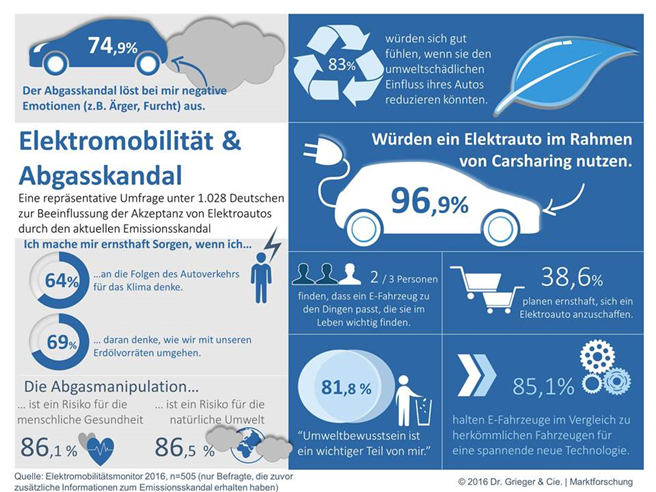 Das Marktforschungsinstitut Dr. Grieger und Cie. hat im März 2016 im Rahmen einer repräsentativen Umfrage 1.028 Deutsche zwischen 18 und 69 Jahren online zu verschiedenen Faktoren rund um die Akzeptanz von Elektrofahrzeugen und deren Beeinflussung durch den aktuellen Emissionsskandal befragt.