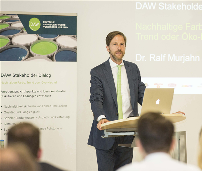 Die Handlungsfelder der DAW-Nachhaltigkeitsstrategie sind – neben dem „Nachhaltigen Unternehmen" – die „Nachhaltigen Gebäude" und „Produkte". Dr. Christoph Hahner, innerhalb der DAW-Geschäftsleitung verantwortlich für Forschung & Entwicklung, erläuterte die nachhaltige Produktphilosophie: „Unsere Innovationsstrategie folgt den Leitprinzipien Ästhetik, Funktionalität, Ökologie und Energieeffizienz." Er ist sich sicher, dass der Einsatz von nachwachsenden Rohstoffen und die Klimathematik in Zukunft eine immer größere Rolle spielen werden. Bereits in diesem Jahr brachte die DAW daher sowohl für den Profi-Verarbeiter (Caparol CapaGeo) als auch den Baumarktkunden (Alpina Klima-Weiss) Produktlinien in den Farben-Markt, die speziell auf Nachhaltigkeit ausgerichtet sind.